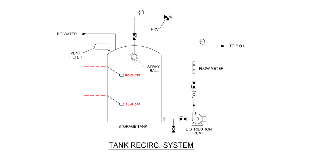 A distribution pump will continuously recirculate the RO/DI water back to the storage tank when the facility is not demanding water therefore the water in the tank is always being agitated. The return piping back to the tank will require a pressure regulating valve to adjust flow. A spray ball at the tank inlet is also helpful to thoroughly wash the inside walls of the tank. Since this pump runs continuously it is a good idea to have a float switch in the tank to shut the pump down if the tank is low of water.